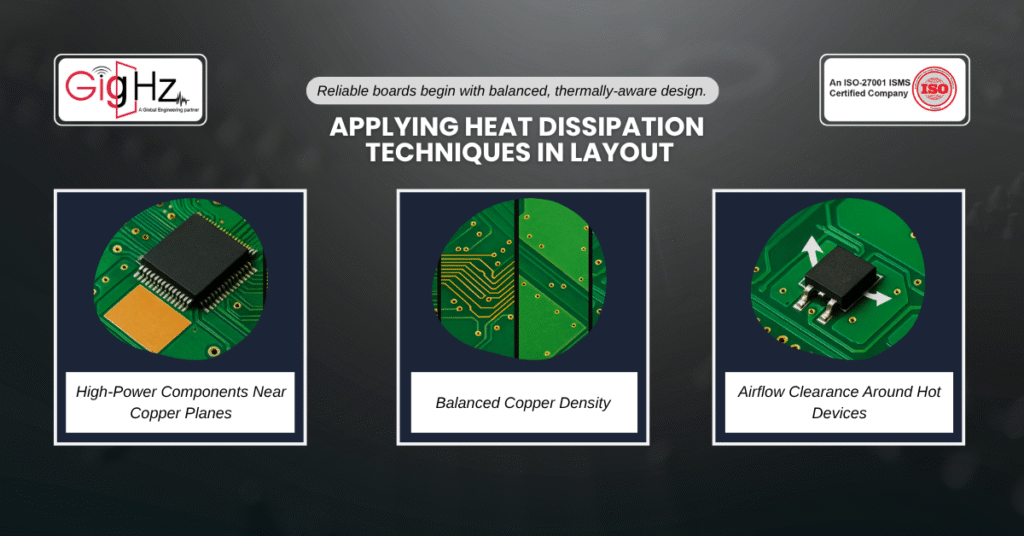 Good PCB heat dissipation techniques aren’t limited to adding fans or heat sinks—they begin with layout. Also, placement, copper balancing, and spacing all contribute to heat flow.